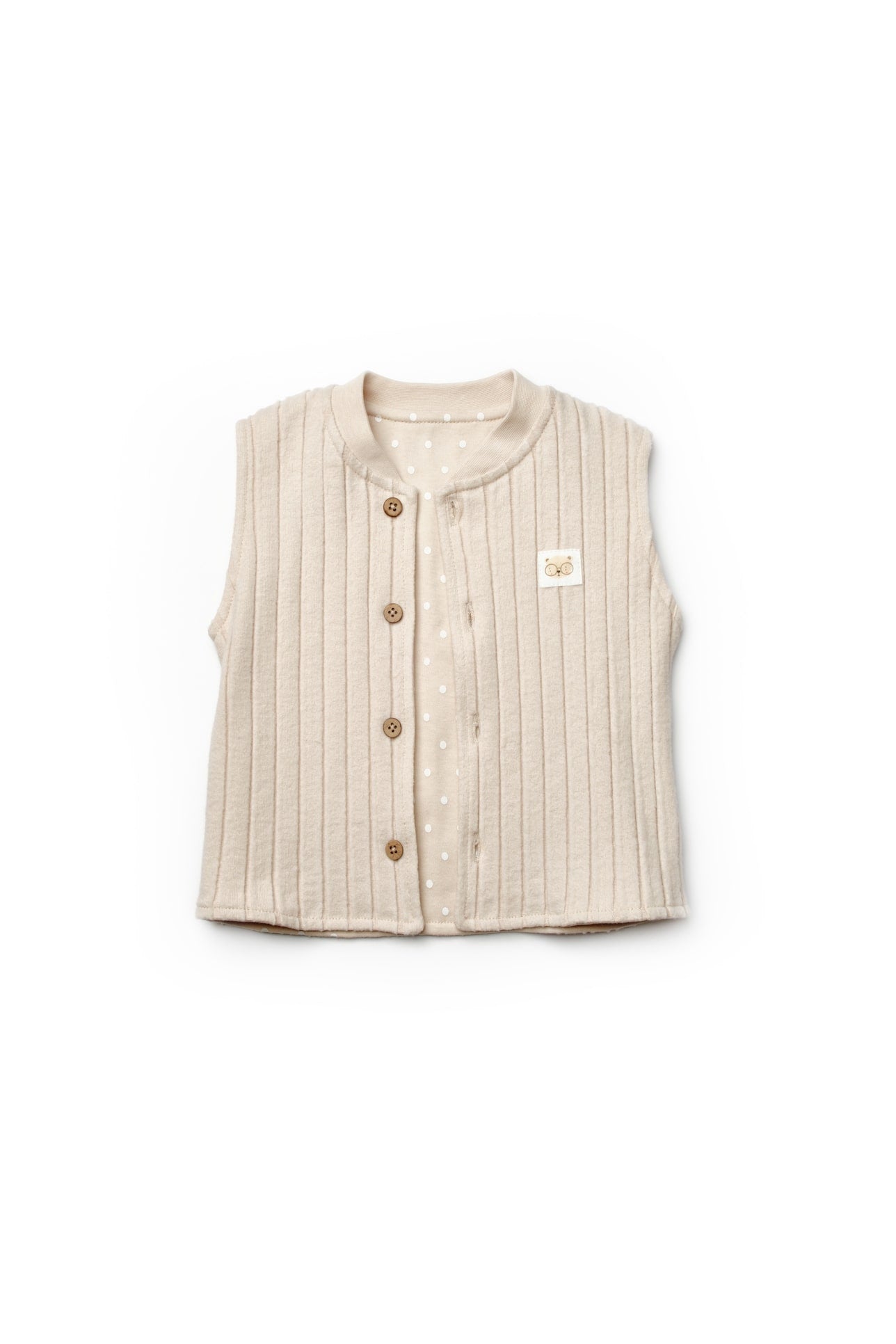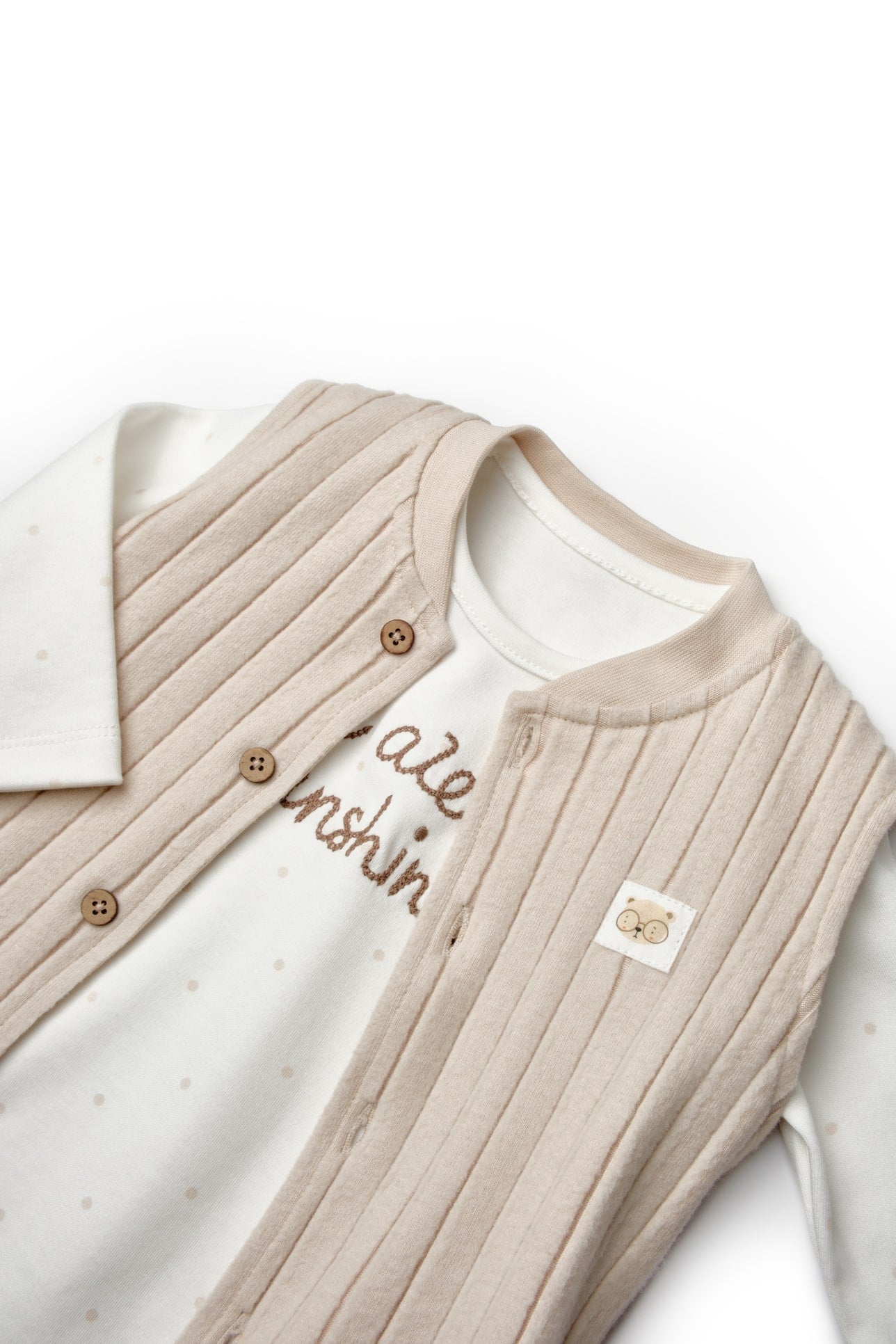 Deze prachtige set van 100% biologisch katoen biedt alles wat jouw kleintje nodig heeft. Een comfortabele lange mouw romper, een warm vest en een soepel broekje. De kleertjes zijn gemaakt in zachte ecru/walnoot tinten die je eindeloos kan combineren.