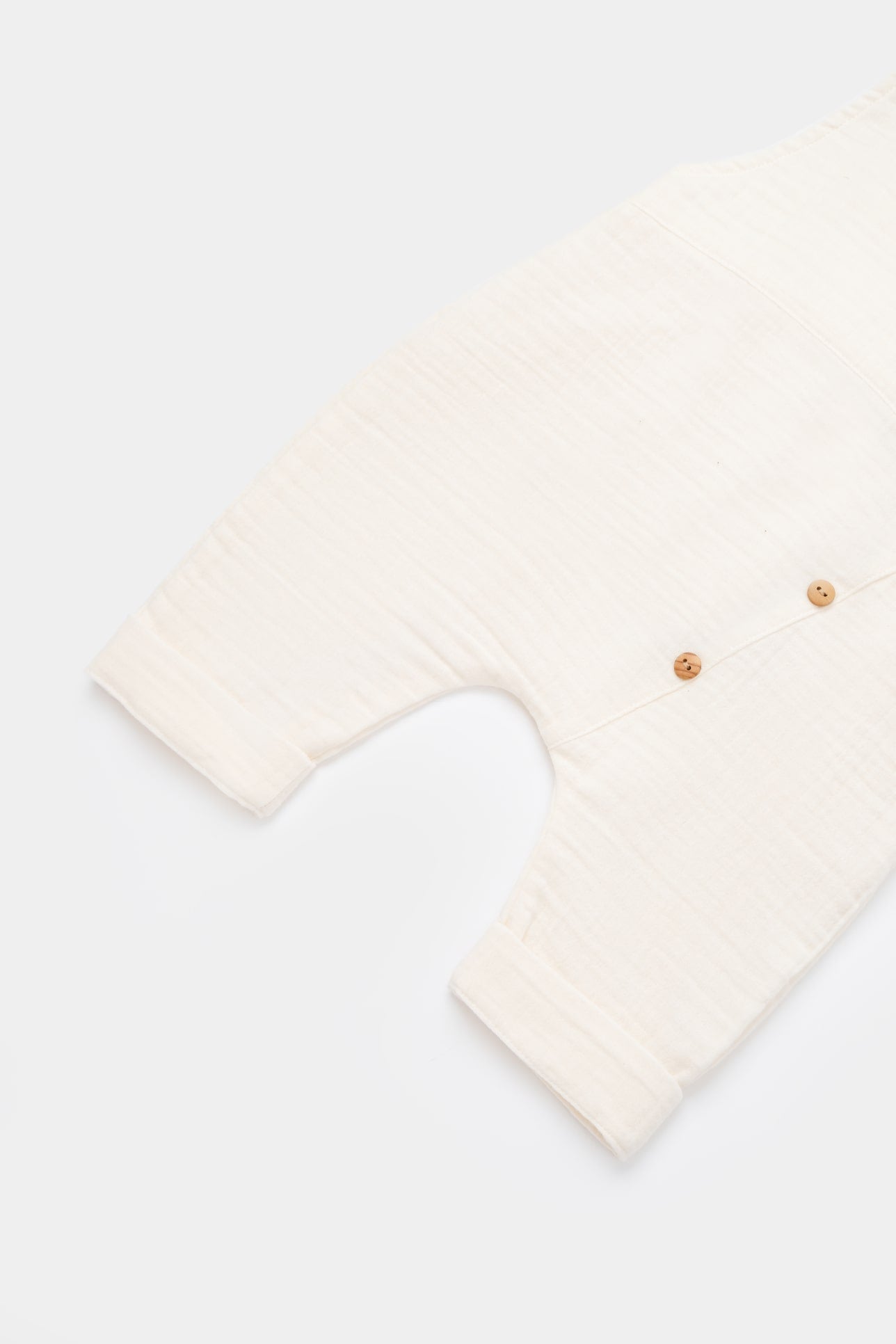 De mousseline voelt superzacht aan op de huid en heeft een mooie natuurlijke structuur. Een fijn boxpakje met voldoende bewegingsvrijheid voor nieuwsgierige kleintjes. Op de romper zijn leuke kleine houtkleurige knoopjes geplaatst voor een stijlvolle afwerking.