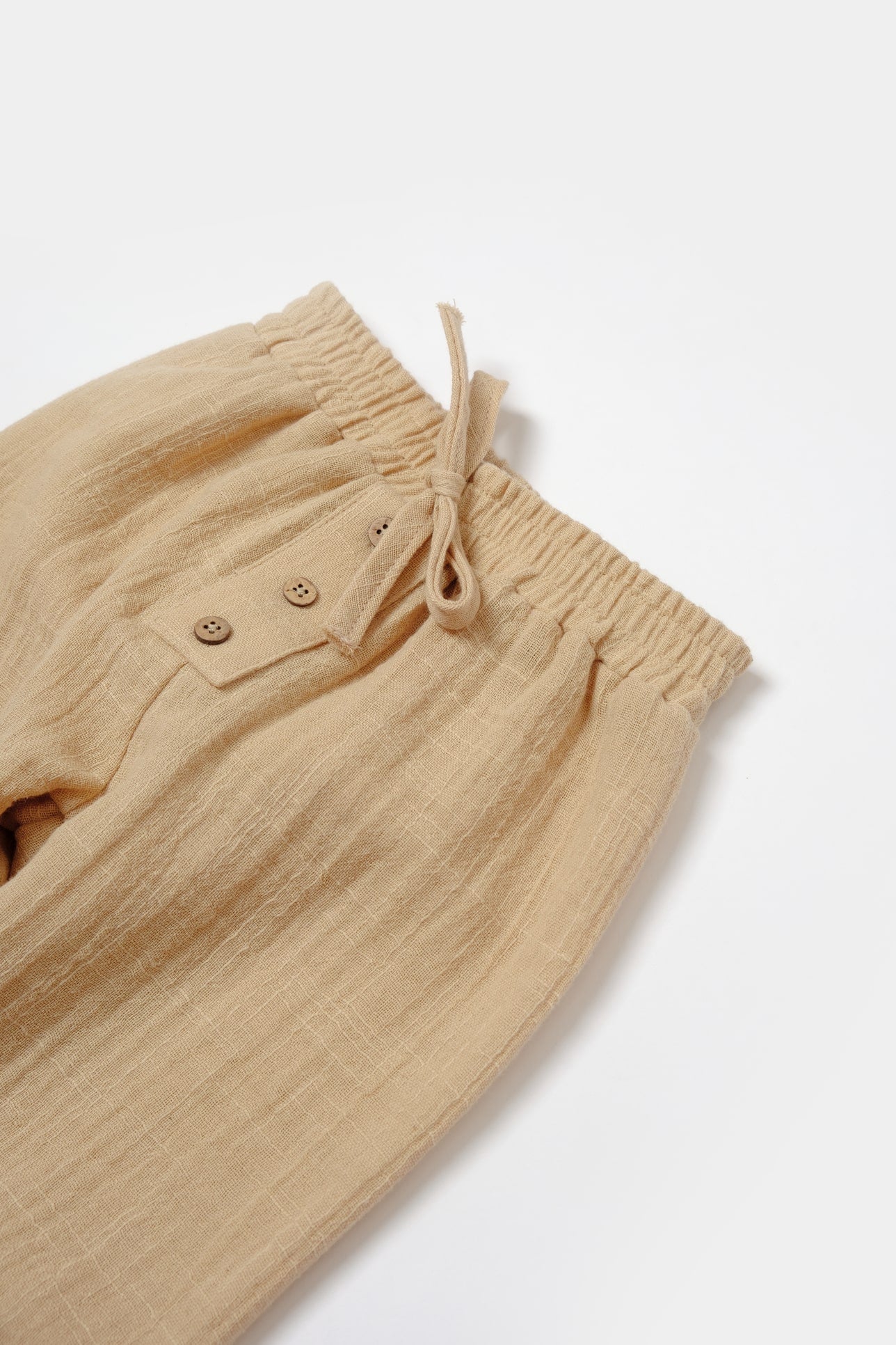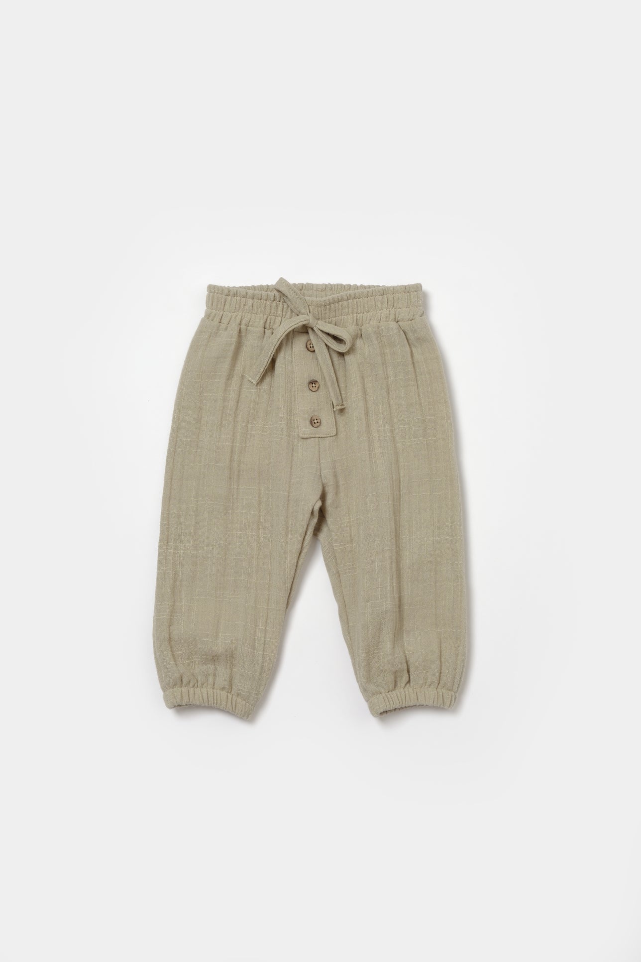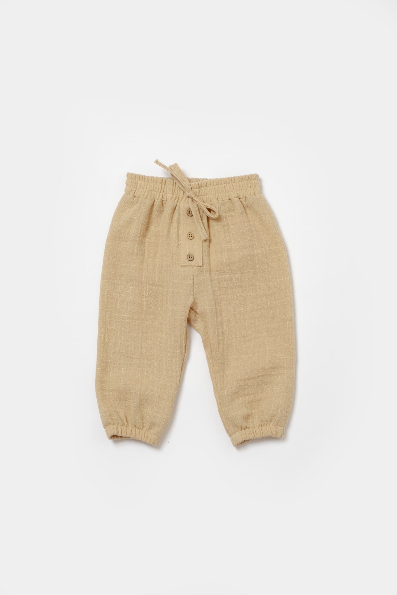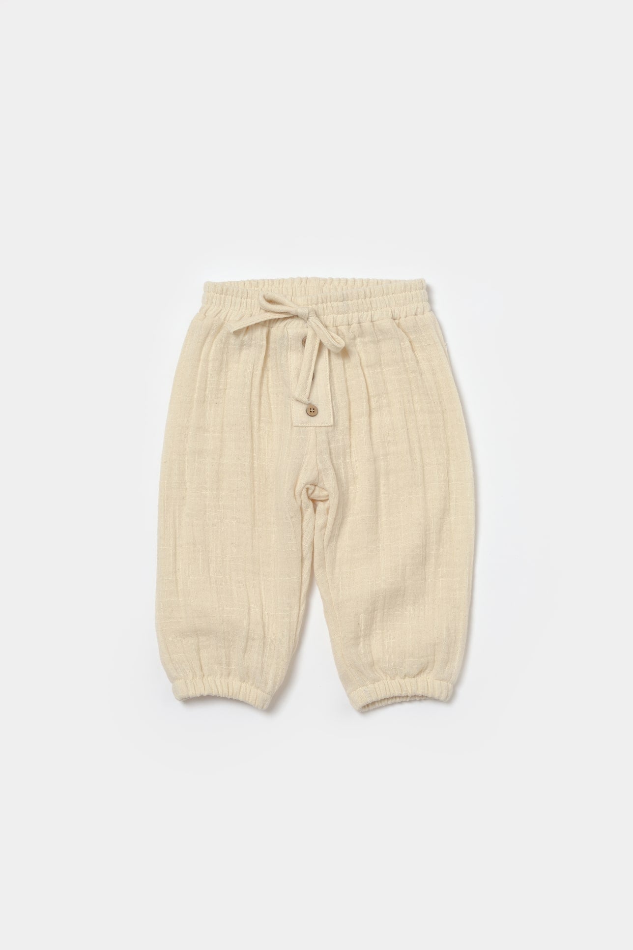 Dit luchtige en comfortabele babysetje bestaat uit een zacht truitje en een bijpassend broekje, beide gemaakt van 100% biologisch katoenen mousseline. De stof is heerlijk licht en ademend – perfect voor warmere dagen of als comfortabele binnen kleding.